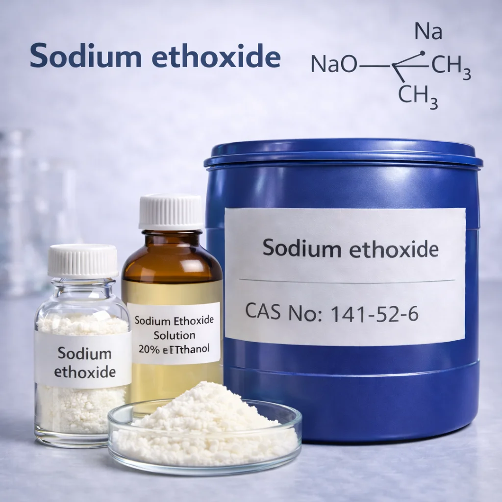 Sodium Ethoxide (sodium ethylate, CAS 141-52-6, C₂H₅ONa) is a strong alkoxide base widely used in biodiesel ethyl ester production, pharmaceuticals, agrochemical intermediates, polymer modification, and fine chemicals. It efficiently promotes transesterification, condensation (e.g., Claisen/Dieckmann/Knoevenagel), elimination, and selective deprotonation/alkylation steps with fast, clean kinetics. Supplied as a free-flowing solid or ethanolic solutions (e.g., 18–21% w/w or custom), it offers high basicity and excellent compatibility in ethanol systems. Each lot is controlled for assay, low moisture, and low carbonate, with COA/TDS available. Highly moisture-sensitive and caustic—protect from air/CO₂ and handle dry;